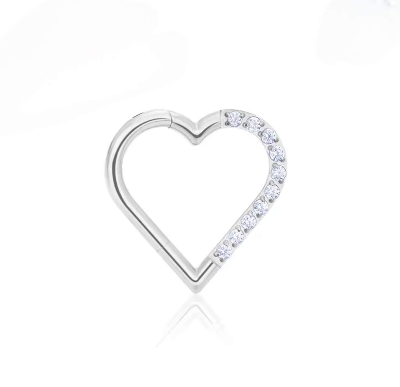 Tytanowy CLICKER serce z cyrkoniami – kolczyk do piercingu lewego ucha Srebrny