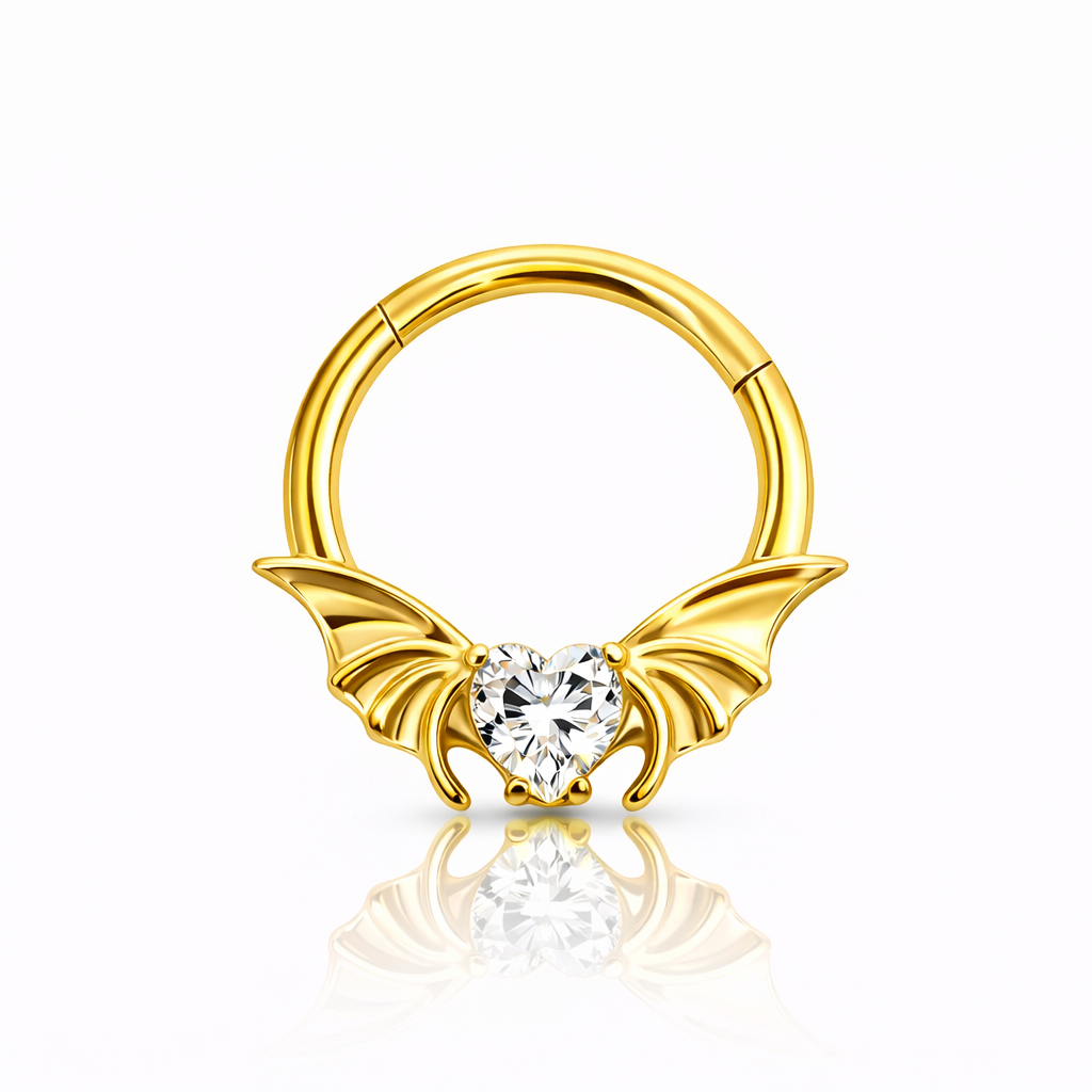 Kolczyk do piercingu typu clicker z cyrkonią w kształcie serca i skrzydeł w kolorze złotym. Wykonany z tytanu implantacyjnego ASTM F136. Stylowa i wygodna biżuteria do piercingu ucha, nosa i septum. Bezpieczny dla skóry, łatwy w zakładaniu dzięki zapięciu clicker. Idealny na co dzień i na wyjątkowe stylizacje.