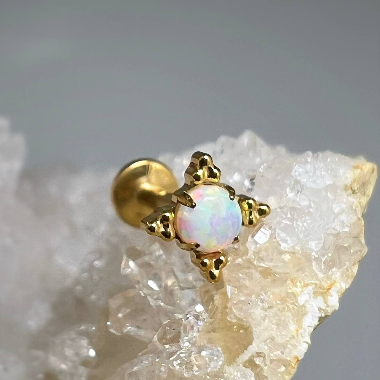 Labret do piercingu z syntetycznym opalem osadzonym w dekoracyjnej oprawie. Wykonany z tytanu ASTM F-136, hipoalergiczny i bezpieczny dla skóry wrażliwej. Odpowiedni do wielu przekłuć ucha: helix, tragus, conch, lobe, forward helix i flat. Dostępny w kolorze srebrnym lub złotym.
