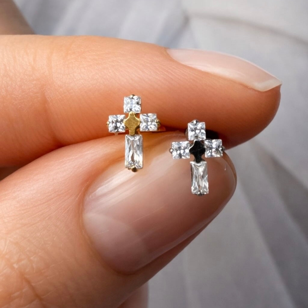 Stylowy kolczyk labret w kształcie krzyżyka, ozdobiony cyrkoniami o różnym szlifie — baguette i square. Wykonany z hipoalergicznego tytanu ASTM F-136, bezpieczny dla skóry wrażliwej. Idealny do piercingu ucha: helix, tragus, conch, lobe i flat. Subtelny, biżuteryjny akcent, który dodaje elegancji każdej stylizacji.