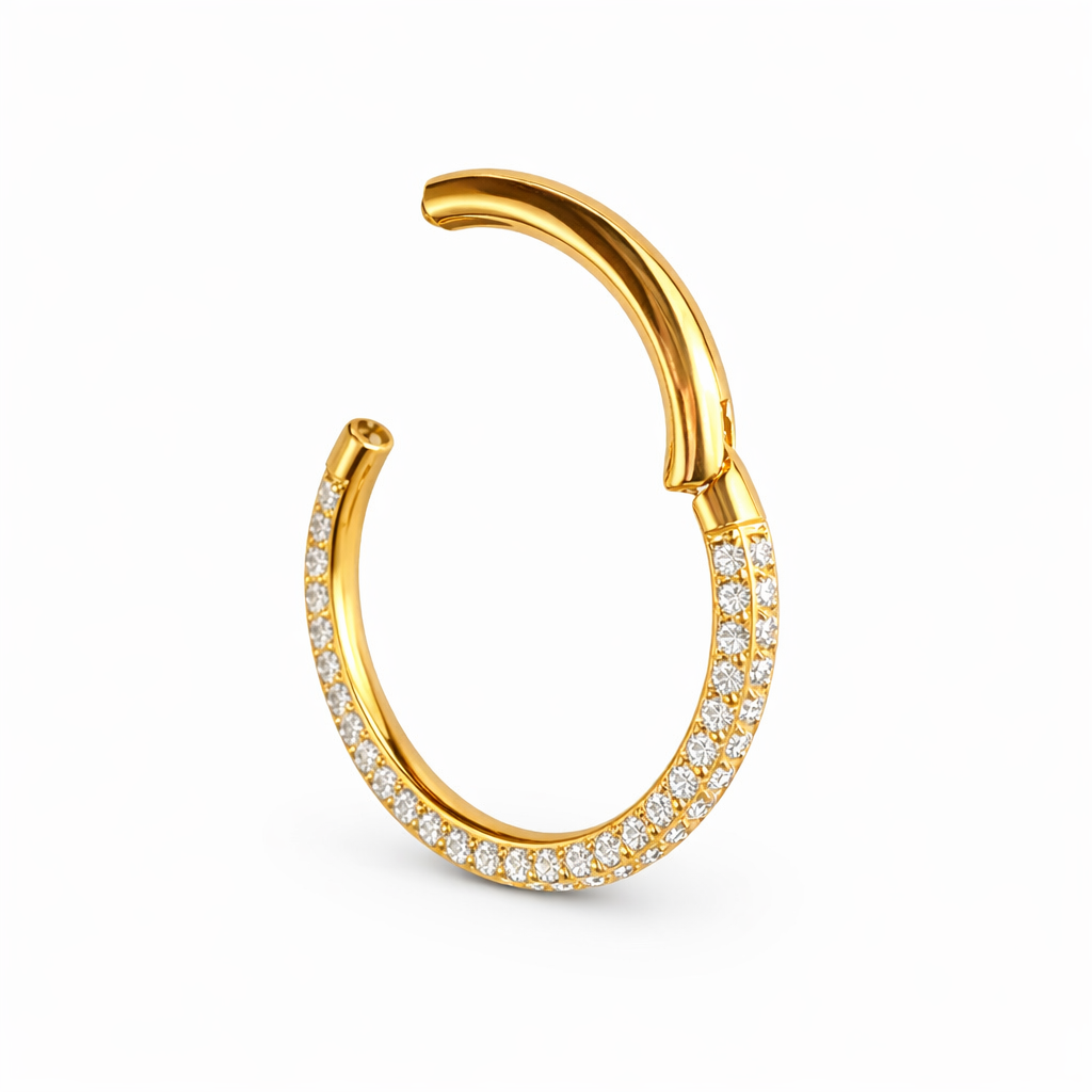 Tytanowy kolczyk do piercingu typu clicker z cyrkoniami. Idealny do helix, conch, daith i septum. Hipoalergiczna biżuteria do piercingu, odporna na wodę i bezpieczna dla skóry. Dostępny w kolorze złotym i srebrnym.