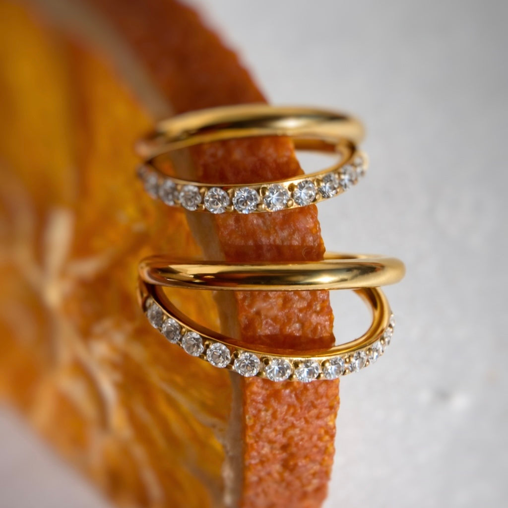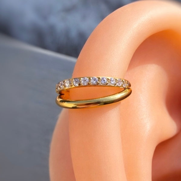 Złote tytanowe kółko clicker z białymi cyrkoniami. Efektowna biżuteria do piercingu ucha, która pięknie odbija światło.