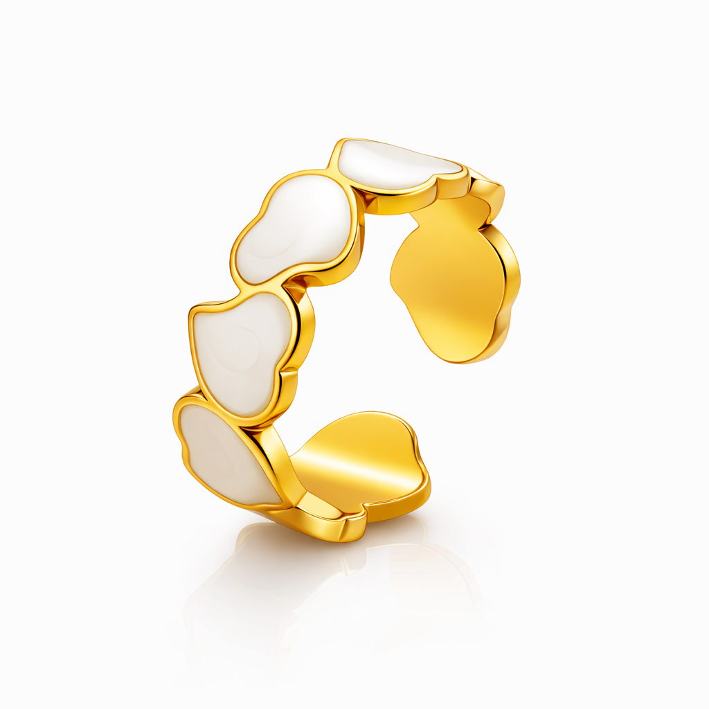Nowoczesny pierścionek z masą perłową o organicznej, nieregularnej formie, który łączy elegancję z artystycznym designem. Złote wykończenie pięknie kontrastuje z mlecznobiałą masą perłową, tworząc efekt subtelnego luksusu i ponadczasowego stylu.