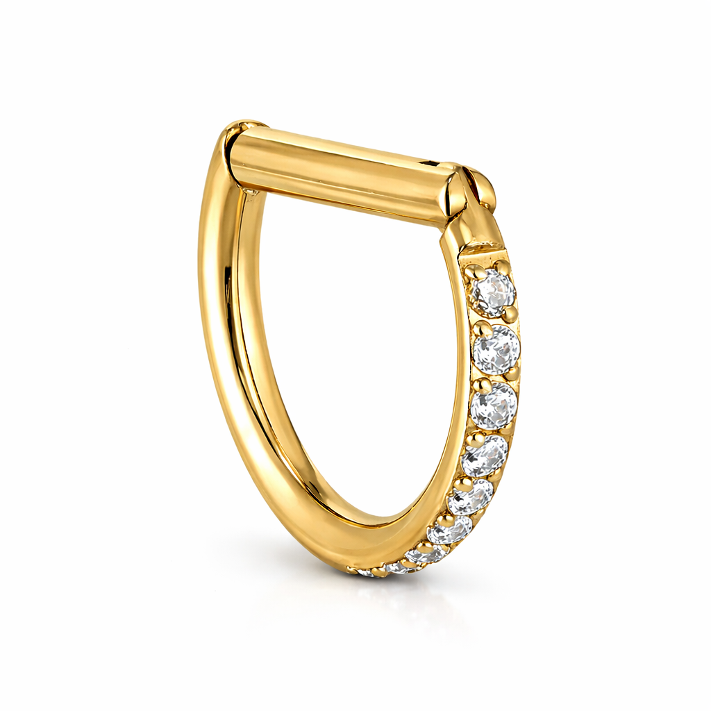 Tytanowy kolczyk do piercingu typu clicker z cyrkoniami w kolorze złotym.Idealny do helix, lobe i septum.Hipoalergiczny tytan implantacyjny ASTM F-136.Bezpieczny dla skóry i odporny na wodę.