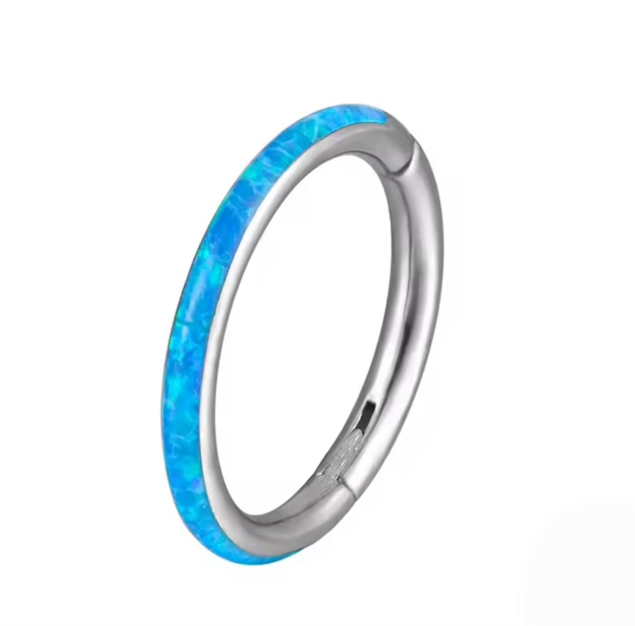 Tytanowy clicker srebrny z niebieskim opalem – kolczyk do piercingu ucha i nosa