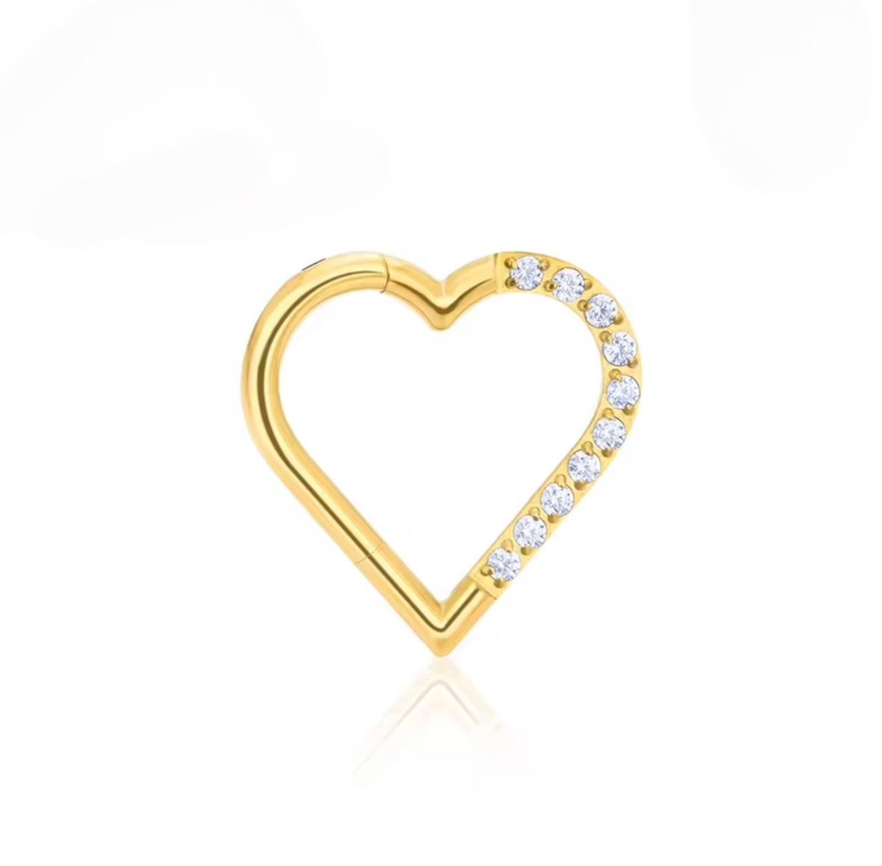 Tytanowy CLICKER serce z cyrkoniami – kolczyk do piercingu lewego ucha złoty