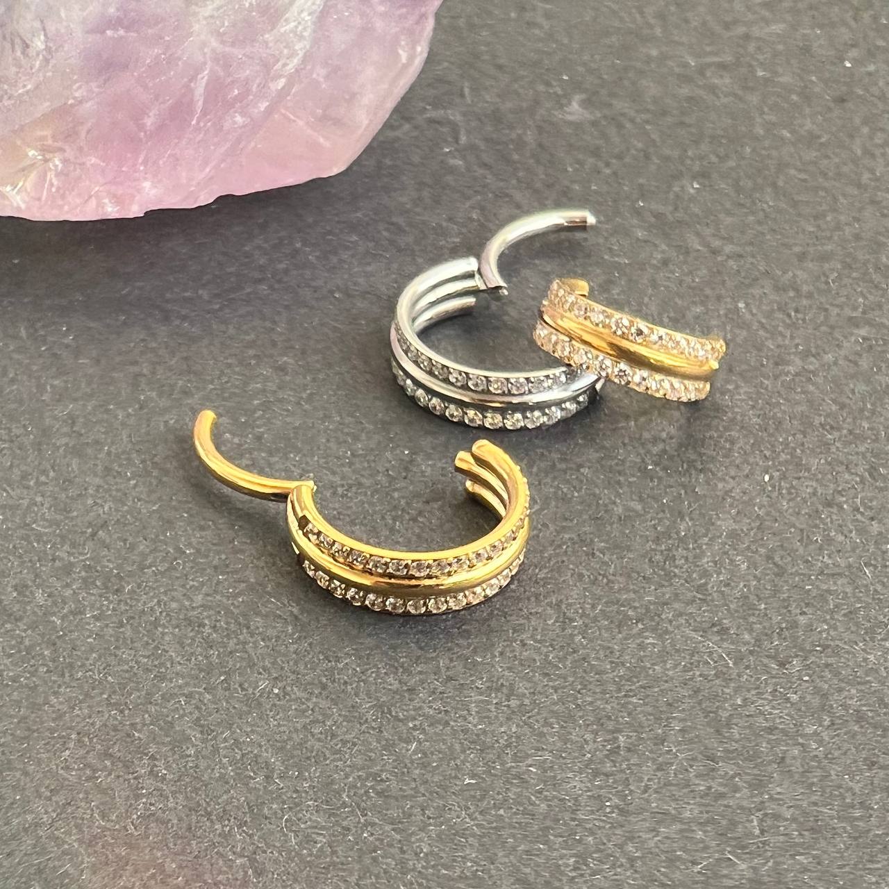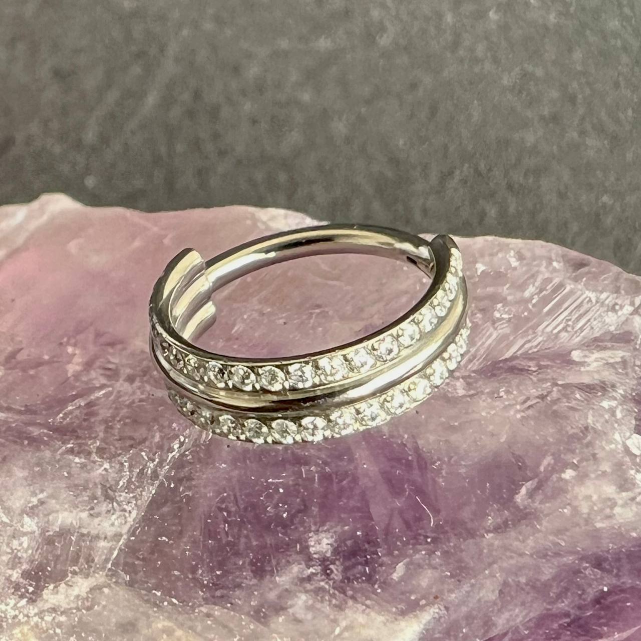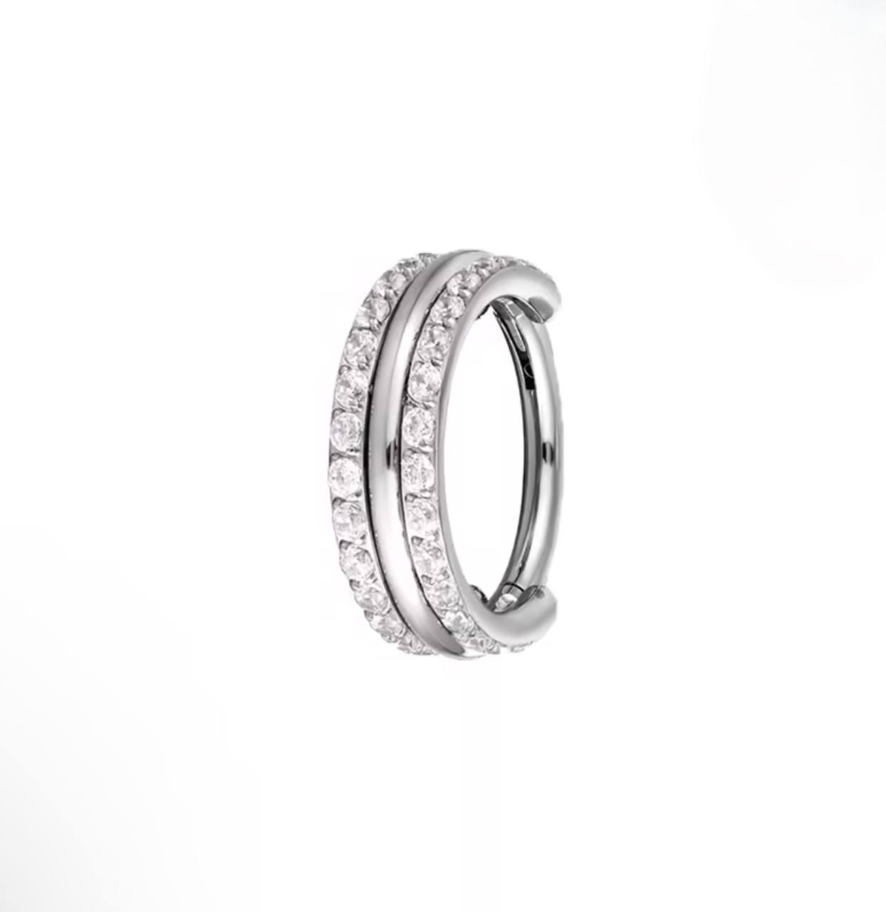 Tytanowy kolczyk clicker z podwójnym rzędem cyrkonii – kółko do piercingu ucha Srebrny