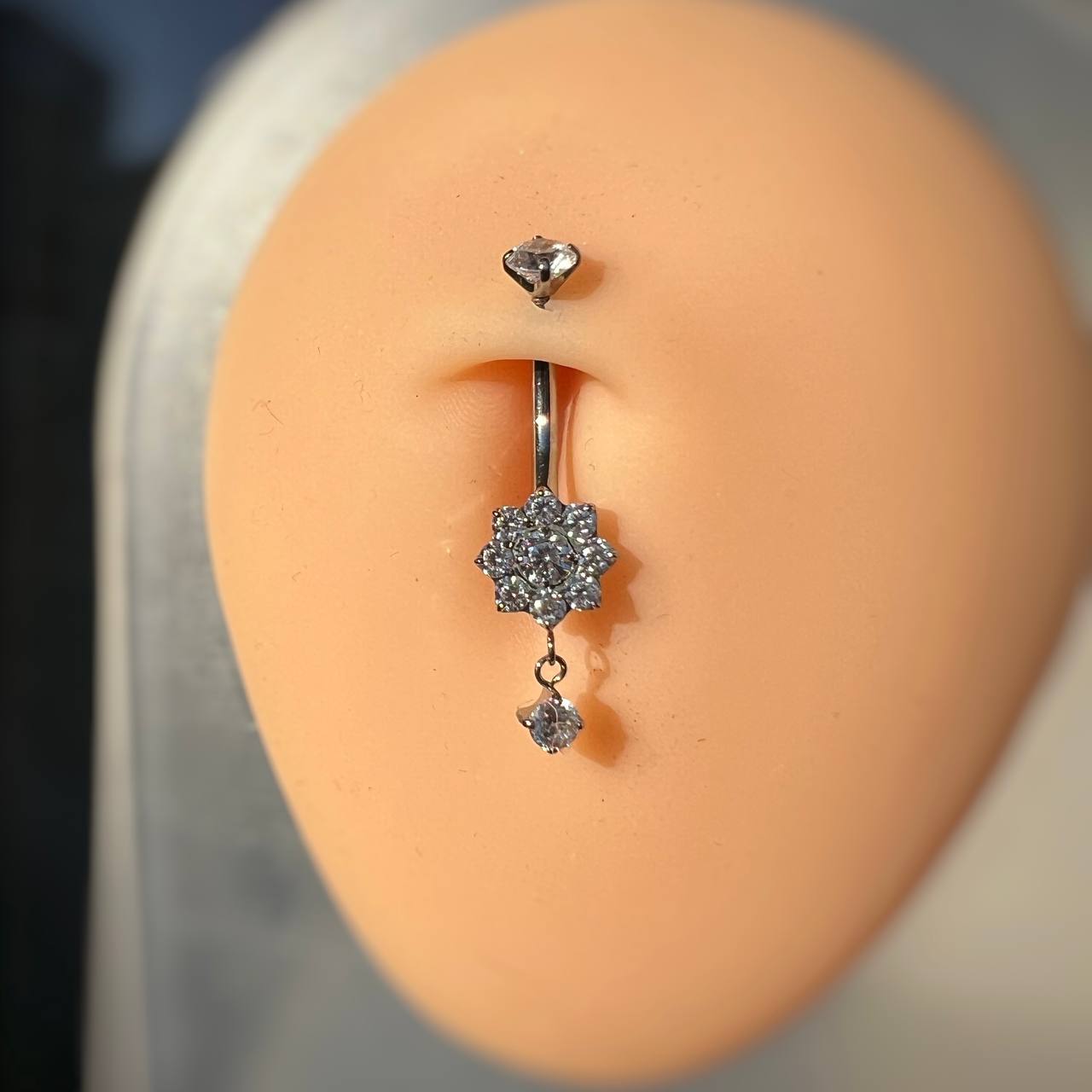 Tytanowy KOLCZYK do pępka Srebrny kwiat z białymi cyrkoniami