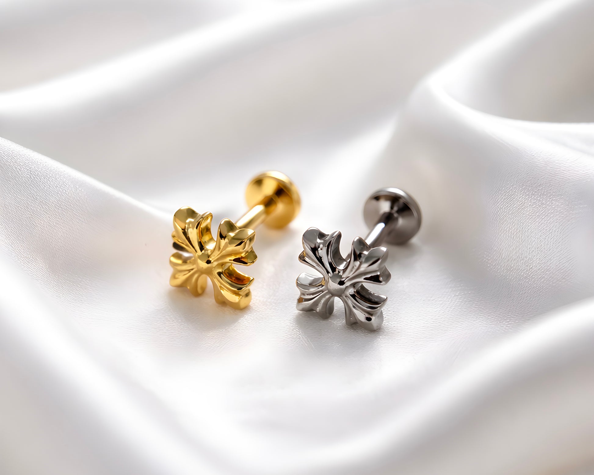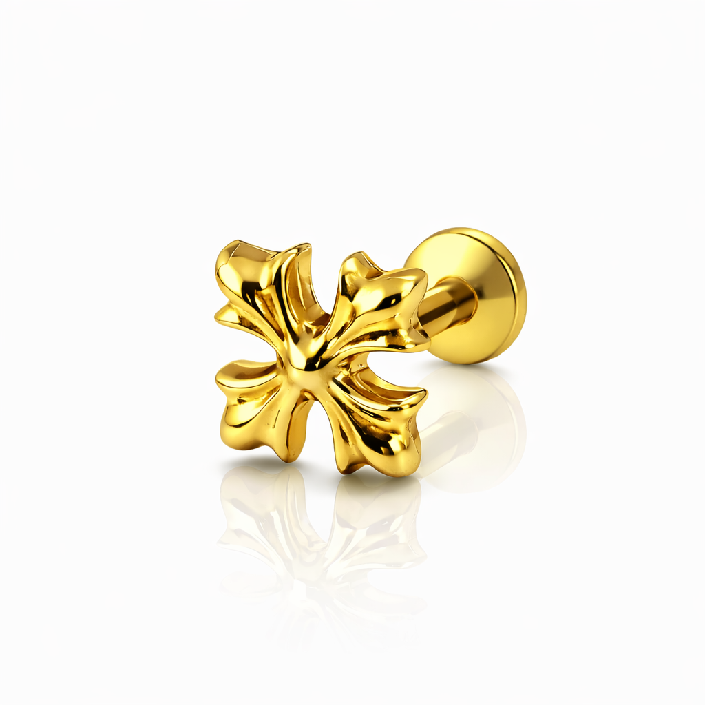 Labret do piercingu z gwintem wewnętrznym, wykonany z tytanu implantacyjnego ASTM F-136, w kształcie delikatnego kwiatu. Biżuteria jest hipoalergiczna, bez niklu i bezpieczna również do świeżych przekłuć. Złote wykończenie oraz płaska baza zapewniają wysoki komfort noszenia i stabilne ułożenie w uchu.