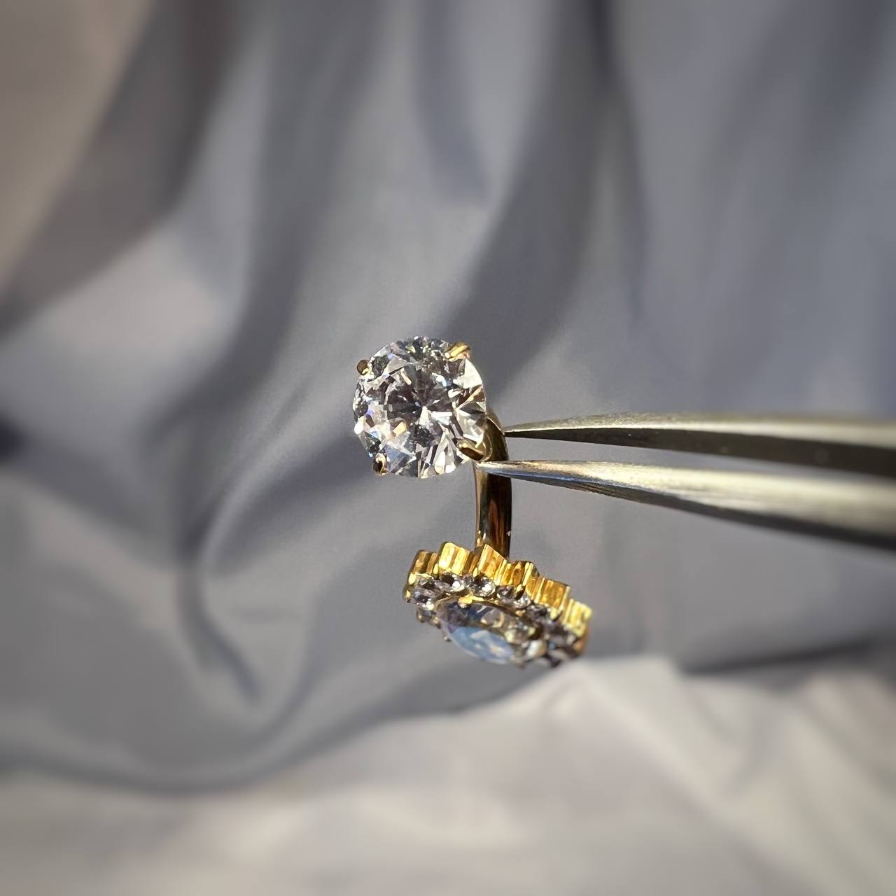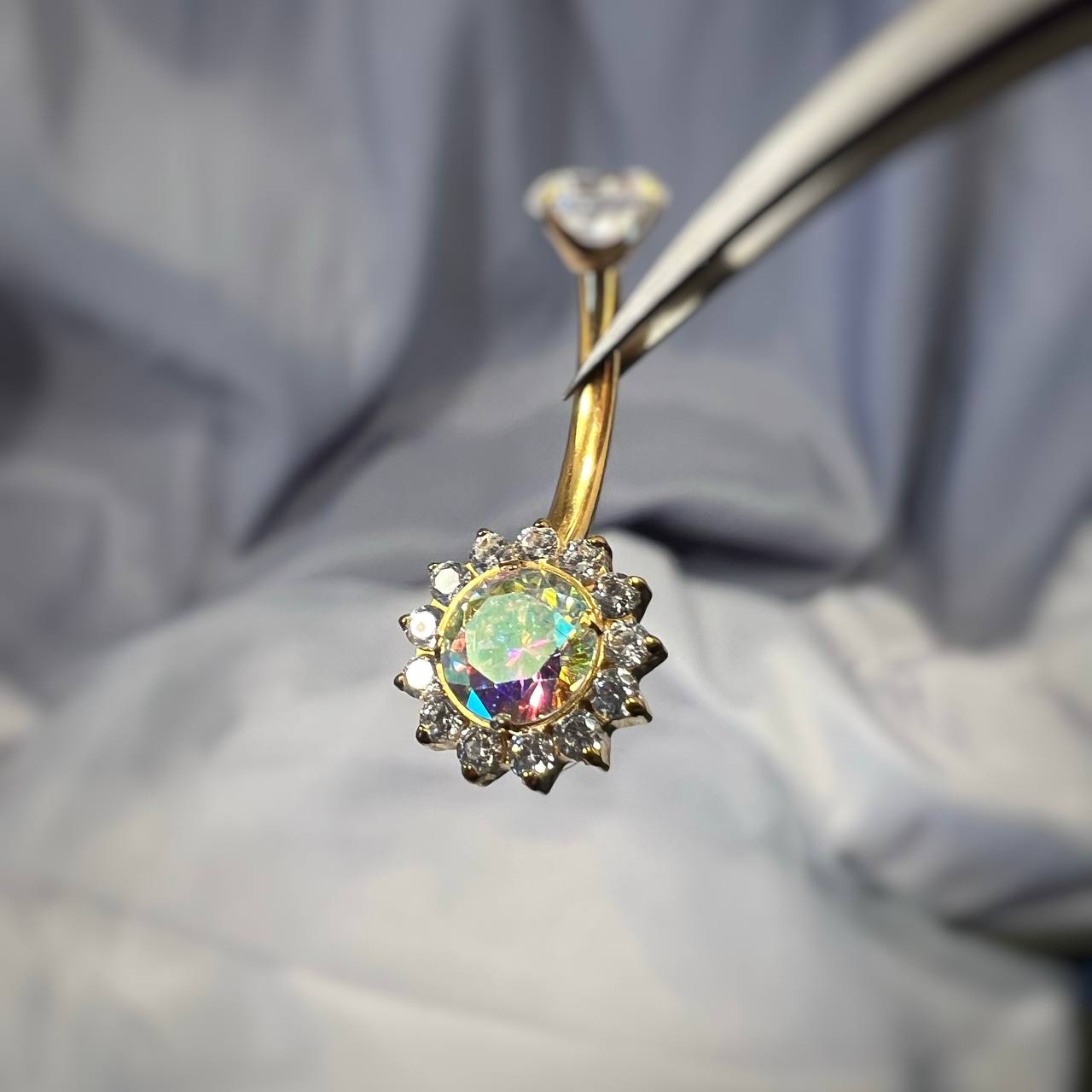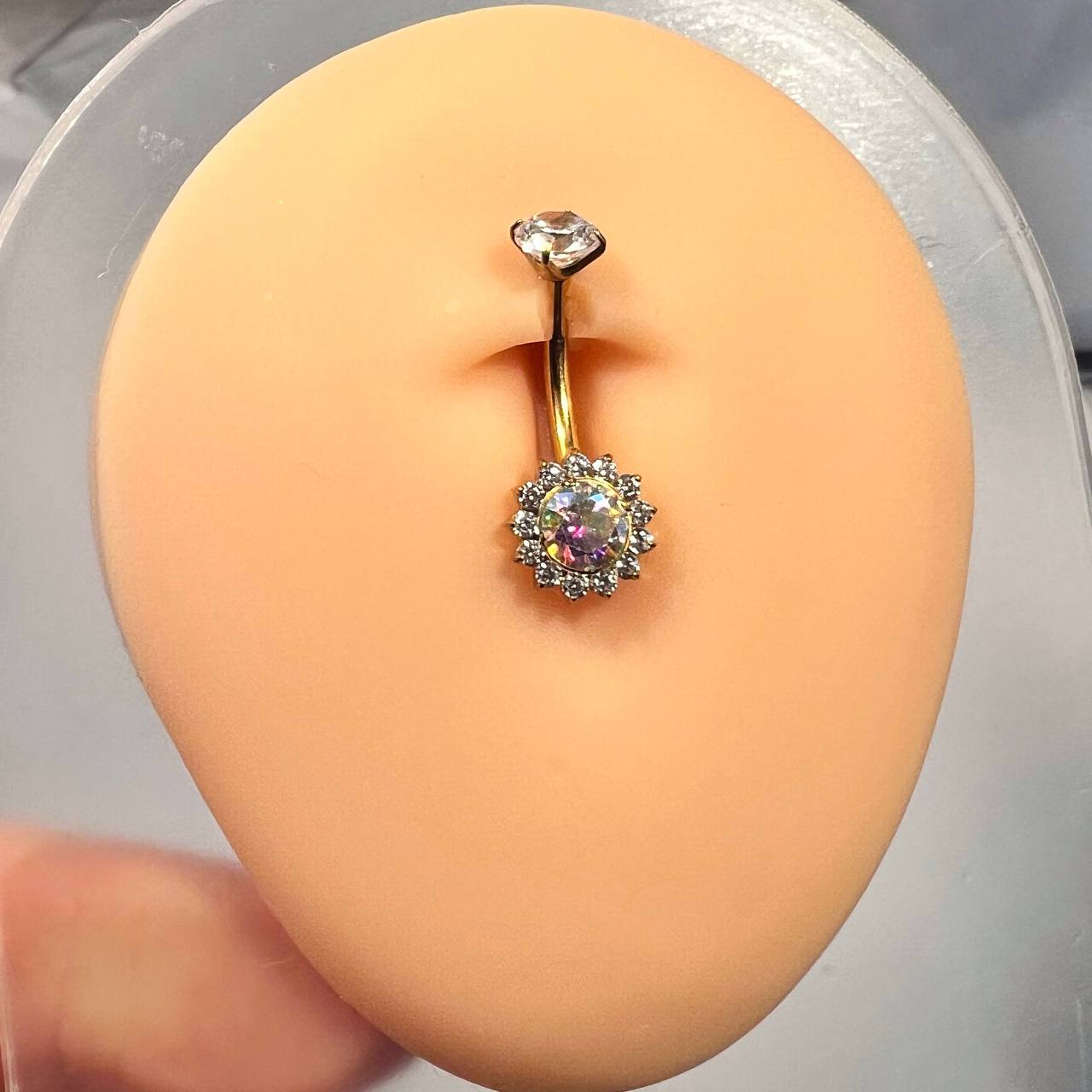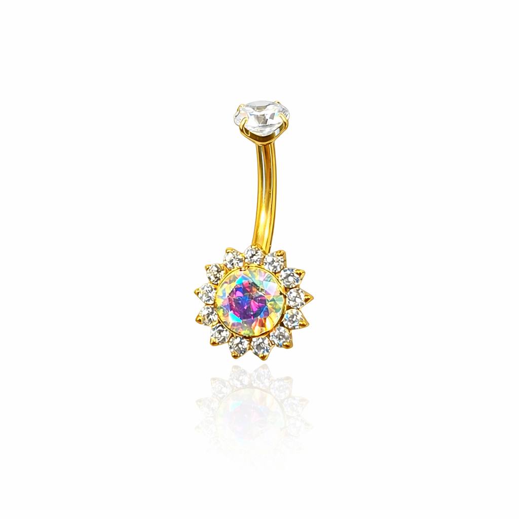 Tytanowy złoty kolczyk do pępka w kształcie kwiatka z cyrkoniami