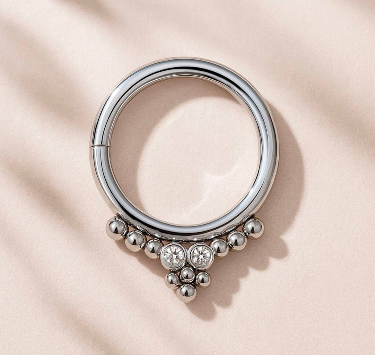 Wykonany z tytanu klasy implantacyjnej G23, jest całkowicie bezpieczny nawet dla najbardziej wrażliwej skóry.