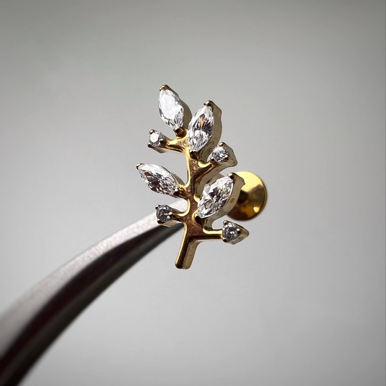 Złoty kolczyk do piercingu ucha – labret gałązka z cyrkoniami